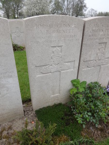Gunner Albert Barnett died of wounds on 3 August 1917 on the Western Front and was buried in the Lijssenthoek Military Cemetery, Belgium, B11.
