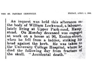 On 3 April 1906, William Lockwood died after falling from a ladder while working on a house at Euston Street, London. At an inquest a few days later, a verdict of “accidental death” was recorded.