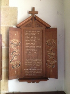 The main War Memorial for the parish of Iping and Chithurst is in the south eastern corner of the nave of the Parish Church of St Mary. Here there is what is referred to in the Vestry Minutes as a ‘War Shrine’ consisting of a carved wooden triptych surmounted by a broken pediment and wooden cross. On this are listed the names of sixteen men from the Great War and two from World War II with the texts “The souls of the righteous are in the Hand of God”, “Make them to be numbered with Thy Saints” on the two side panels. Beneath the names it states: “These men of the parishes of Iping and Chithurst gave their lives for their country in the Great War 1914 – 1918” and the text “Grant them O Lord, Eternal Rest and let light perpetual shine upon them”.
