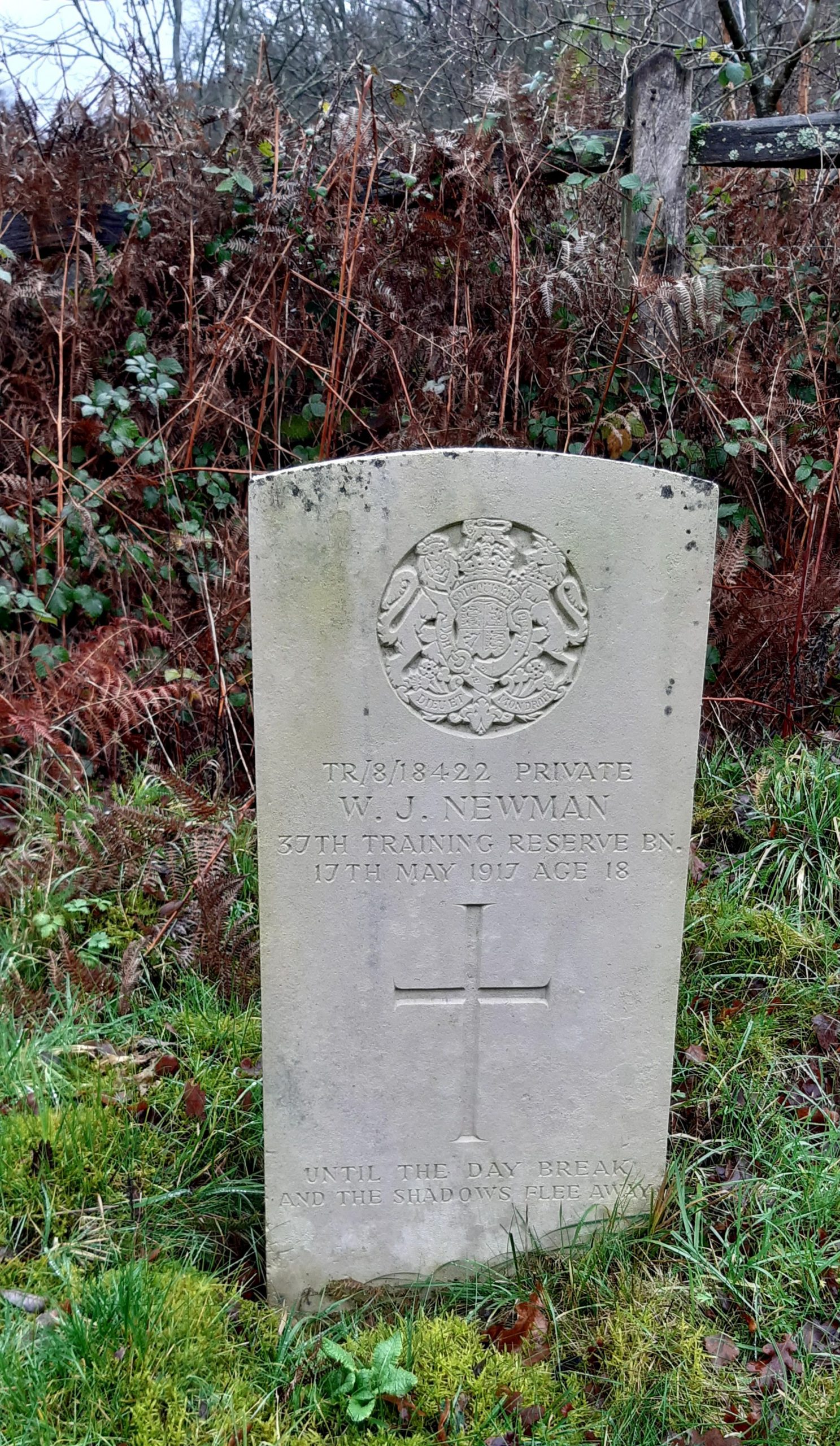 William James Newman (referred to in parish minutes as Jim) was born in Chithurst in 1899 the eldest son of a gamekeeper. He was still in the 37th Training Reserve Battalion for the Royal Berkshire Regiment when he died of illness at the age of 18 in a military hospital in Wiltshire in May 1917.